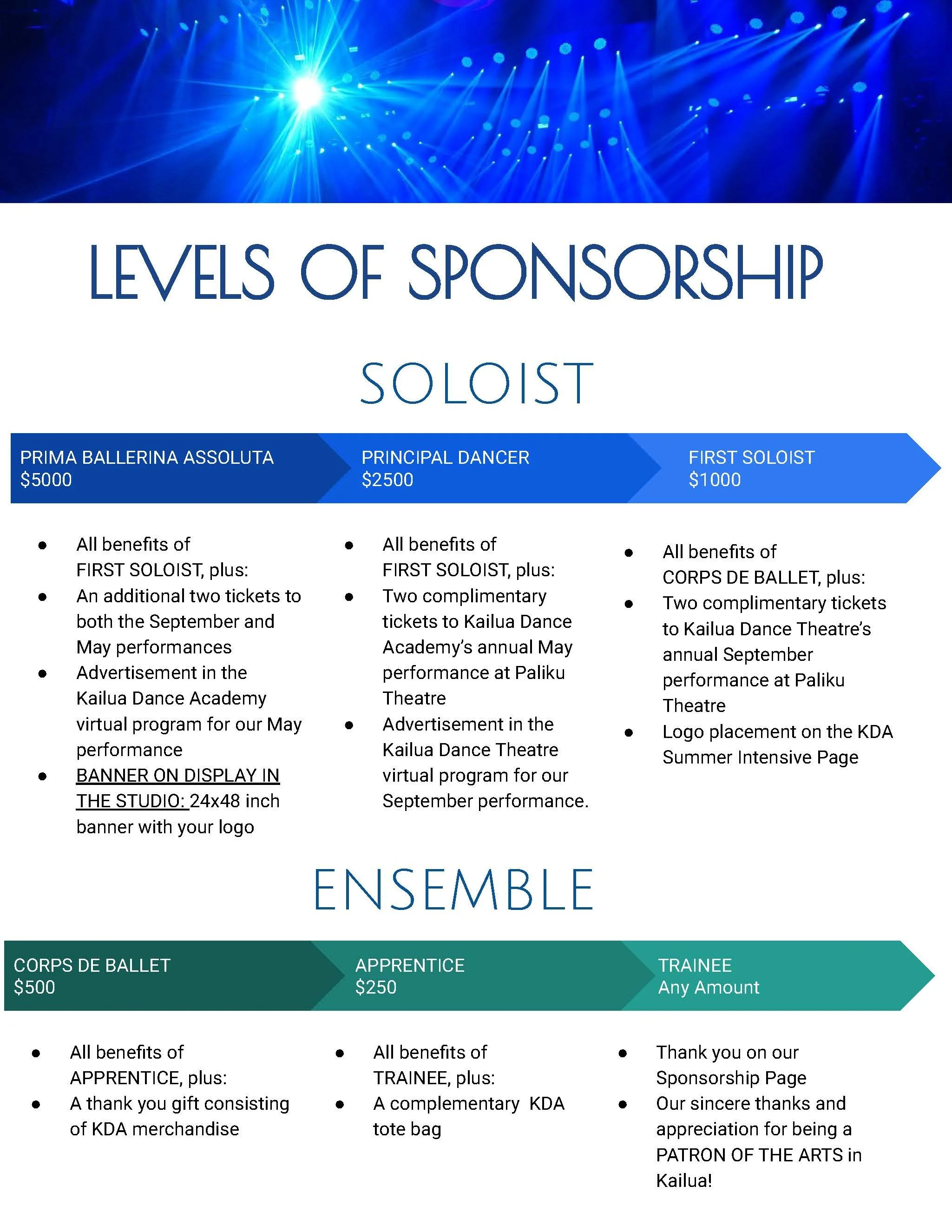 Reach families, dancers, parents, grandparents, and more! Our PRIMA BALLERINA ASSOLUTA SPONSORS get their logo banners displayed alongside the KDA Banner for the 2025-2026 school year! Send us your logo, sized for a 24x48 inch banner, and we will print it and hang it alongside our own!